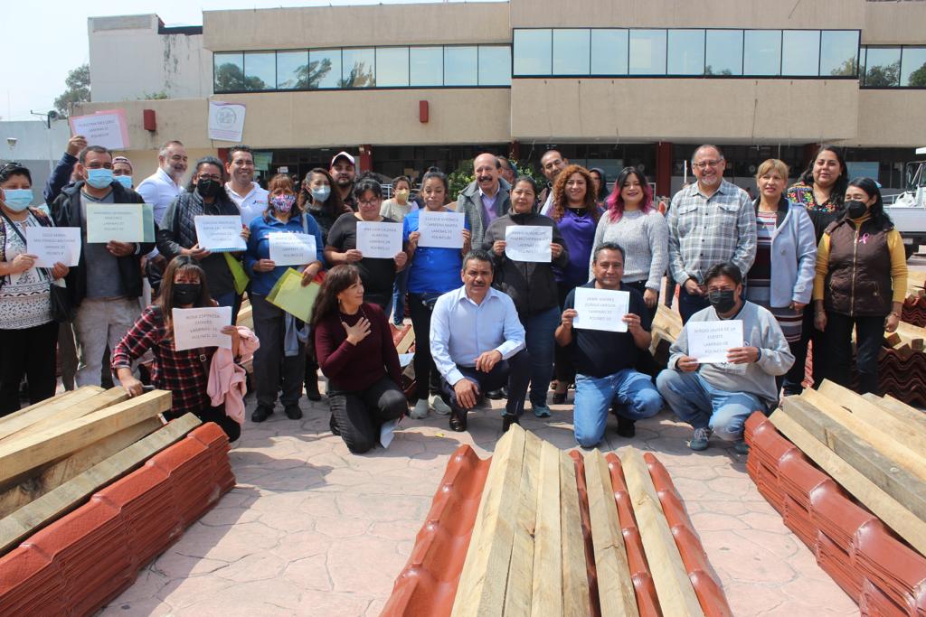 Acompañado de concejales y autoridades de las áreas de Desarrollo Social, Obras y Protección Civil, Armando Quintero realizó la segunda entrega de mil ciento setenta y un láminas y quinientos cuarenta y un polines para 64 viviendas de alto riesgo, beneficiando a 192 iztacalquenses.
