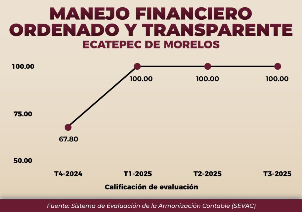 A partir del primer trimestre del 2025, el gobierno de Ecatepec mejoró de manera sustancial el manejo de las finanzas públicas y logró la más alta calificación en las evaluaciones de Armonización Contable practicadas a los 125 Ayuntamientos y otros tantos entes fiscalizables del Estado de México, de acuerdo con el reporte del Sistema de Evaluación de la Armonización Contable (SEVAC).