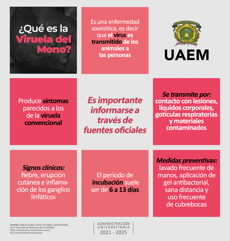 Ante la llegada del primer caso de viruela símica a México, el epidemiólogo de la Facultad de Medicina de la Universidad Autónoma del Estado de México (UAEMéx), Miguel Ángel Karam Calderón, llamó a la población a preservar la calma y continuar con las medidas de salud preventivas como el lavado frecuente de manos o la aplicación de gel antibacterial, mantener la sana distancia y el uso frecuente de cubrebocas.
