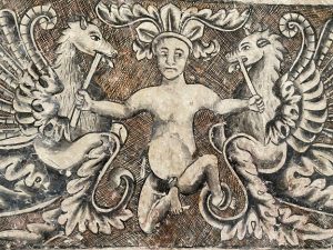 “La pintura mural en el claustro se caracteriza por la presencia de grutescos –motivos que mezclan elementos vegetales y animales con seres fantásticos e imágenes litúrgicas–, propios del siglo XVI”.