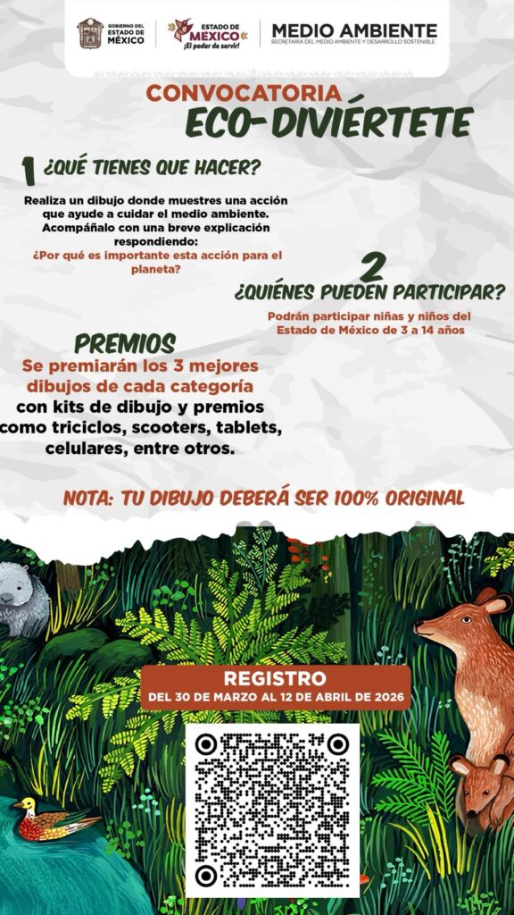 Con el objetivo de fomentar la conciencia ambiental desde la infancia y fortalecer la cultura de sostenibilidad en la entidad, el Gobierno del Estado de México, a través de la Secretaría del Medio Ambiente y Desarrollo Sostenible (SMAyDS), lanzó la convocatoria “Eco-Diviértete 2026”, dirigida a niñas y niños mexiquenses de entre 3 y 14 años de edad.