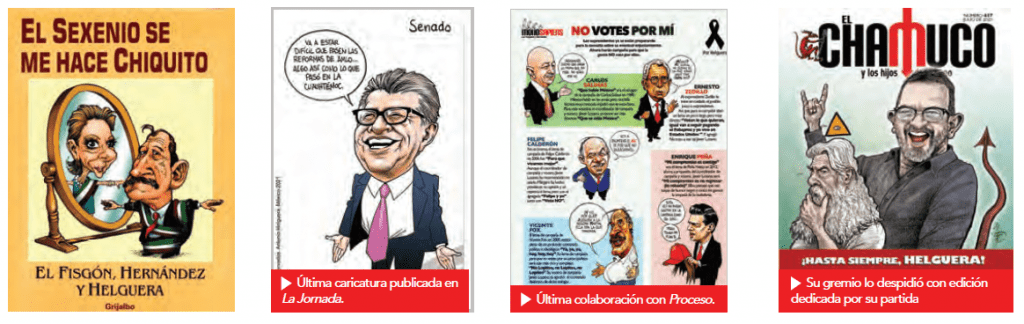 -Helguera y yo eramos como dueto cómico. Trabajamos muchos proyectos juntos desde que nos conocimos hace 26 años. Trabajamos los carteles de La Jornada. Nuestra colaboración en Proceso (16 años); antes en la revista Milenio (ocho años), trabajo que fue el antecedente del Monosapiens. En la revista El Chamuco, luego el programa de television (Chamuco TV). Juntos hicimos otros trabajos, varios libros. Teníamos proyectos para una novela gráfica que ibamos a hacer este año.