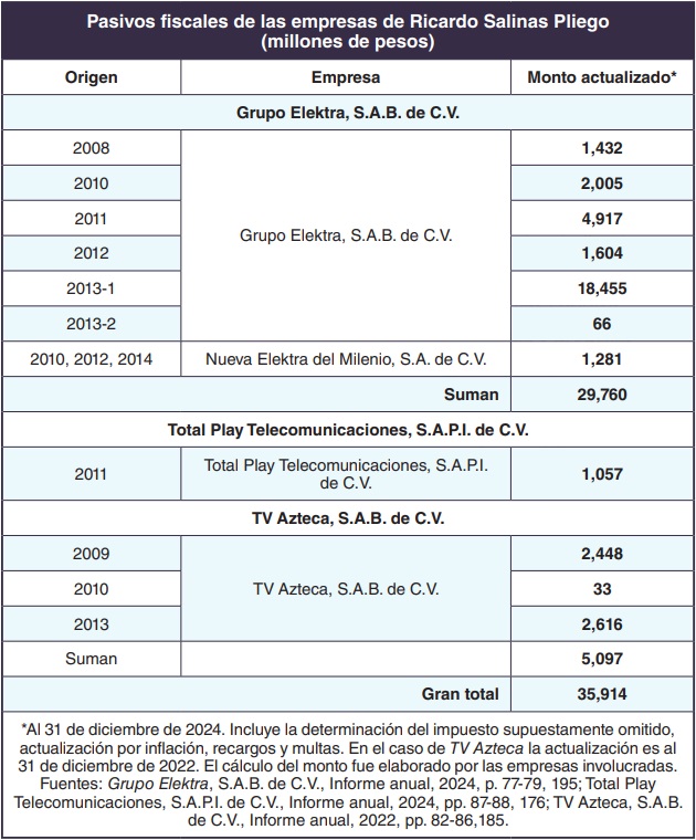 En síntesis, al menos estas dos compañías de Salinas Pliego confiaban en que ganarían los litigios a las autoridades hacendarias en los que están en juego 35.9 mil millones de pesos equivalentes a mil 952 millones de dólares.
