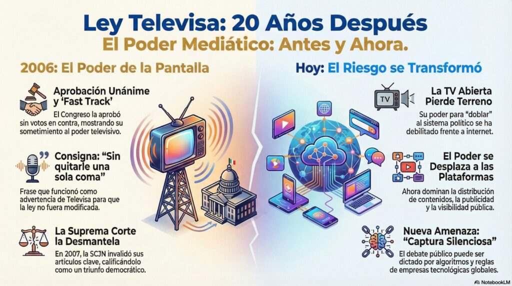 Hace veinte años, el Congreso mexicano dejó una de las postales más incómodas de la relación entre poder político y poder mediático. La llamada “Ley Televisa” no fue únicamente una mala reforma; fue la expresión más nítida de un sistema político dispuesto a plegarse ante la televisión abierta, en pleno periodo neoliberal, cuando la pantalla seguía siendo el principal “soporte” de la vida pública.
