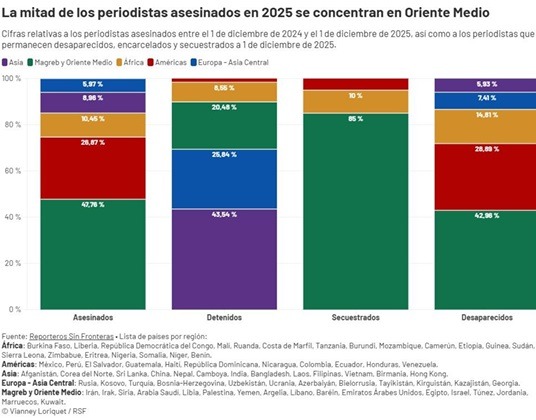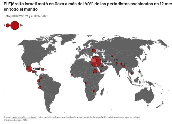 El balance anual 2025 de Reporteros Sin Fronteras, difundido este martes 9 de diciembre, llama la atención sobre un año mortífero para la prensa y advierte que América Latina es donde ocurrió una cuarta parte de los asesinatos de periodistas, y México se afianza como el país más peligroso para el gremio con nueve asesinatos en el año que finaliza.