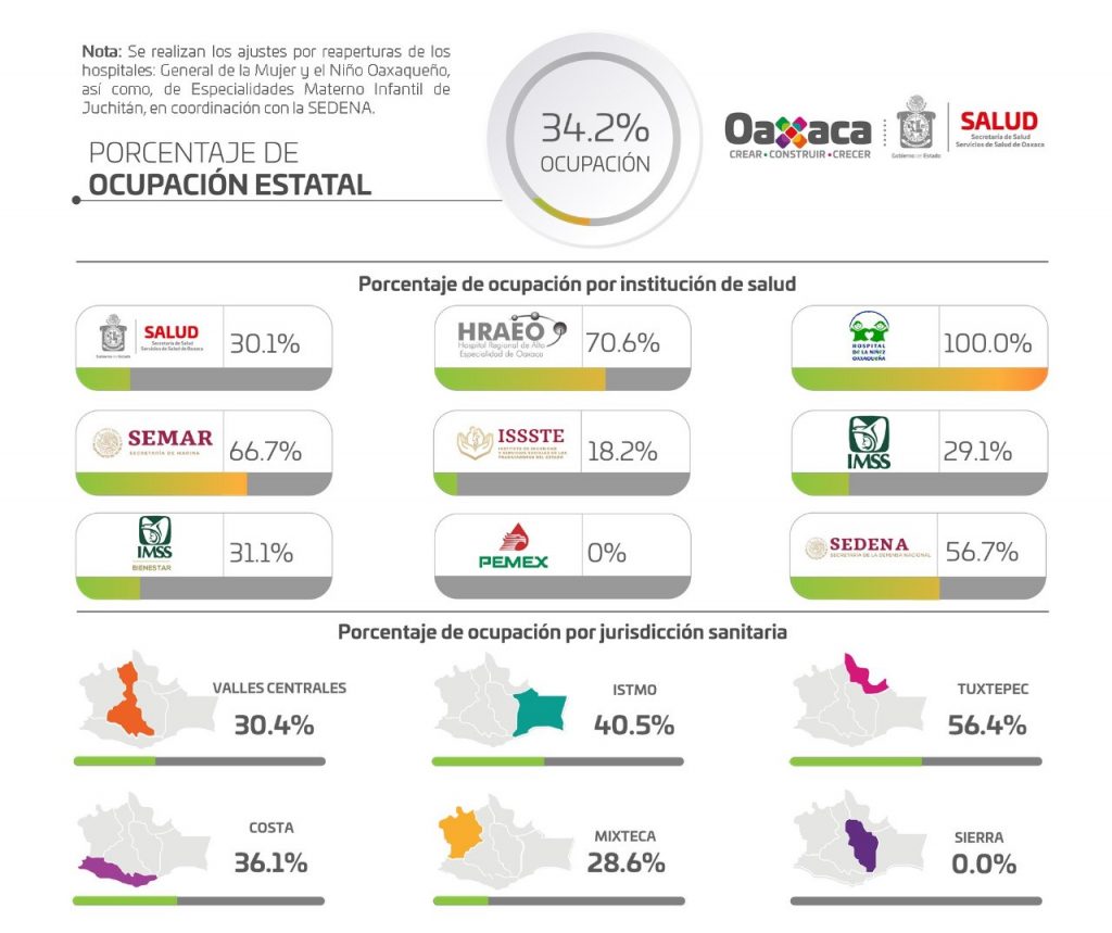 Este jueves, se registran siete hospitales al 100% de ocupación, así como cinco nuevos hospitalizados que suman 145 personas las que reciben atención médica. De las 424 camas destinadas para atender a pacientes con esta patología respiratoria, se encuentran disponibles 279, lo que hace que la saturación de la red médica global sea del 34.2%. Siendo la Jurisdicción Sanitaria de Tuxtepec la que registra el porcentaje más alto, con el 56.4%.