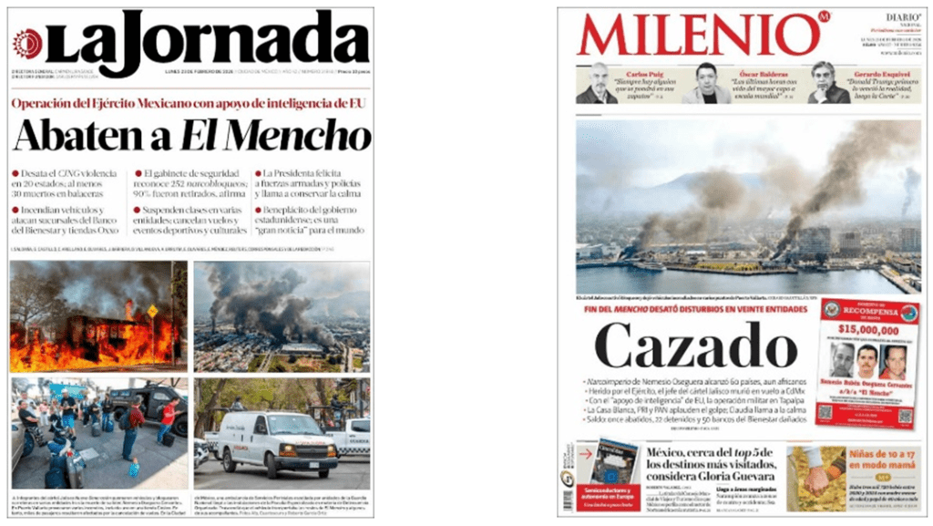 Por ejemplo, La Jornada cabeceó: “Abaten a El Mencho, con un balazo que dice: “Operación del Ejército Mexicano con apoyo de inteligencia de EU”. La cabeza es acompañada de seis resúmenes donde se consigna la violencia desatada por sicarios en entidades del país, al menos 30 muertos; el incendio de bancos y establecimientos comerciales, la suspensión de clases. La felicitación de la Presidenta y el beneplácito del gobierno estadunidenses por aquella operación.