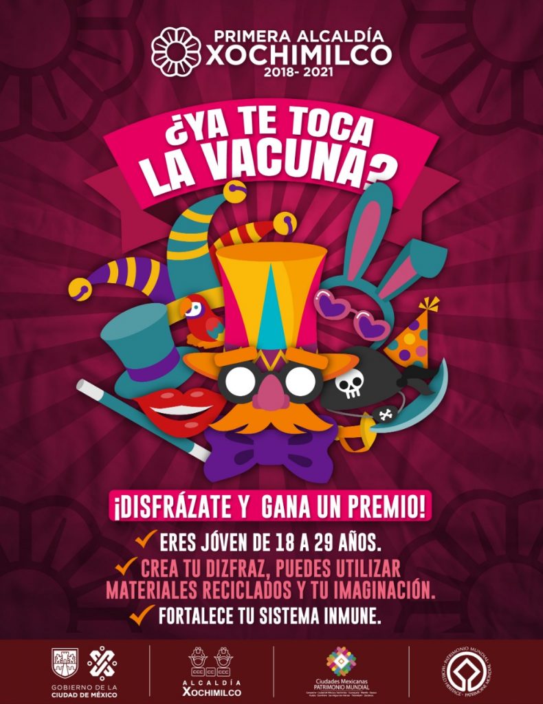 La alcaldía Xochimilco convoca a jóvenes con edades de entre 18 y 29 años a recibir su primera dosis contra el Covid-19, habrá concurso de disfraces, el más ocurrente recibirá un gran premio.