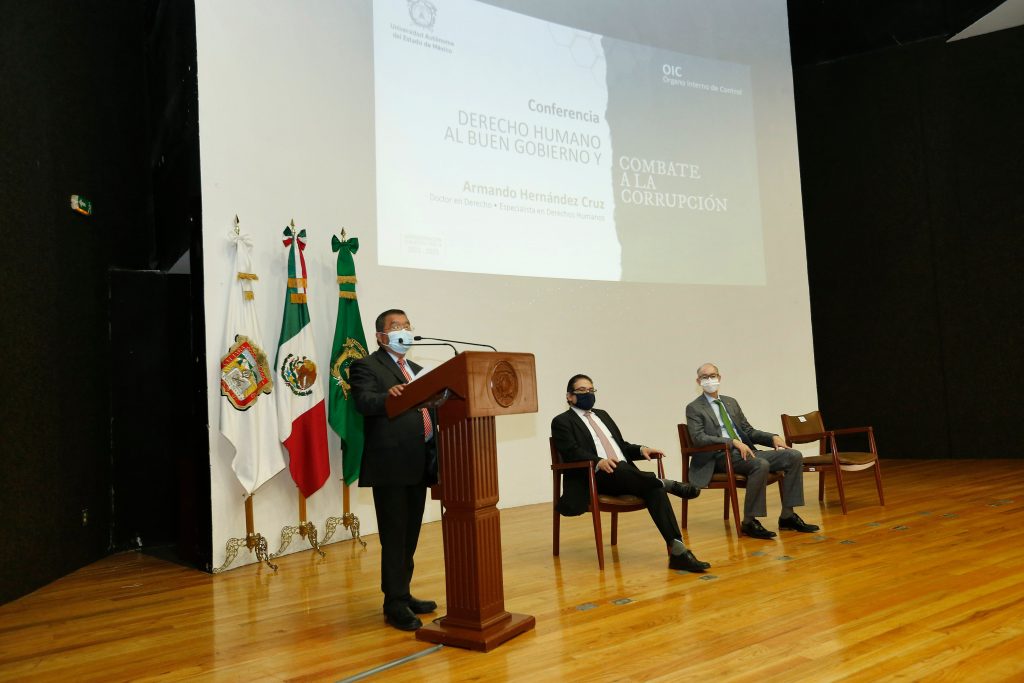● En el marco del segundo año de actividades del Órgano Interno de Control en la UAEMéx, se impartió en la casa de estudios la conferencia magistral “Derecho humano al buen gobierno y combate a la corrupción” dictada por el especialista Armando Hernández Cruz